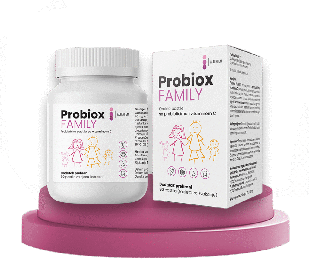 Probiox FAMILY, oralne pastile s probioticima i vitaminom C, prvi su probiotik sa dvojakom funkcijom: djeluju na gornji respiratorni sistem (uho, glo, nos), a ujedno su i dentalni probiotik: djeluju na oralnu šupljinu (zube i desni).